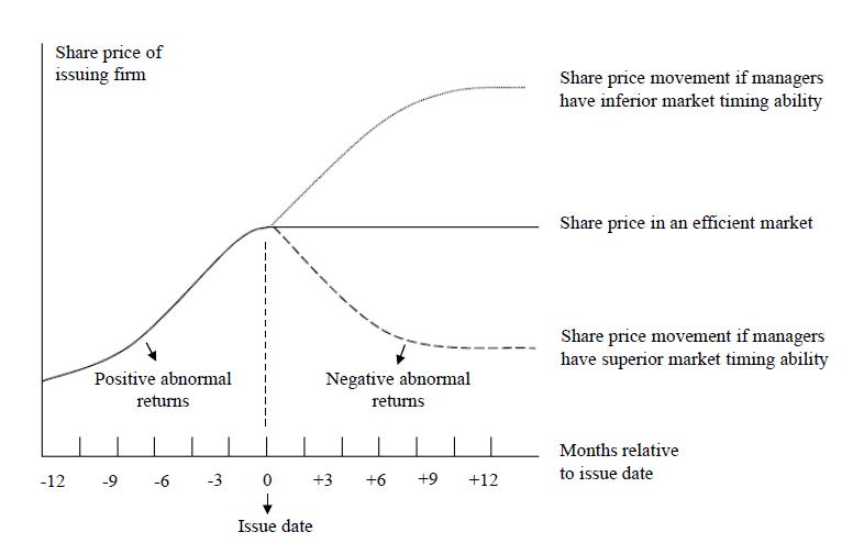 The evidence in Ritter (2003) and Huang, Uchida, and Zha (2016) suggest that companies issue SEOs motivated by market timing behavior. Thus, managers make these offers when the stock is overvalued; in other words, managers have superior market timing skills. After the shares are issued, and the opportunity window closes, firms involved in market timing behavior tend to present negative abnormal returns in the short/medium range due to the adjustment of investors’ expectations.