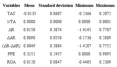 For the treatment of outliers, we used the Winsor technique at the 1st and 99th percentiles. Table 1 presents the variables’ descriptive statistics of the Jones-type models after the winsorizing, referring to the sub-sample.