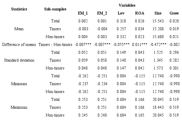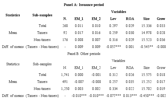 The expectation is to find a higher EM level by companies that engaged in market timing behavior around the issuance of shares. During this period, the difference in EM levels is aggravated (Domingos et al., 2017). Table 3 shows the means of the model’s variables, segregated by periods: issuance period (Panel A) and other periods (Panel B). The table shows total companies have higher levels of EM in the issuance period compared to different periods. Around the SEO period, the average of the EM variable for companies classified as timers (EM_1 = 0.017 and EM_2 = 0.016) is higher than the average of non-timers (EM_1 = 0.008 and EM_2 = 0.007) but not statistically significant, while the EM difference between groups is lower in other periods (EM_1 and EM_2 average of timers = -0.007 and -0.008, respectively; EM_1 and EM_2 average of non-timers = 0.003 and 0.002, respectively).