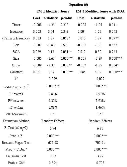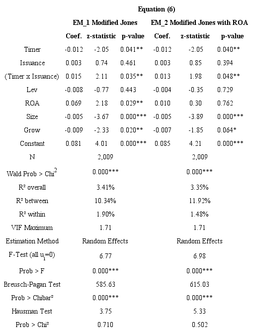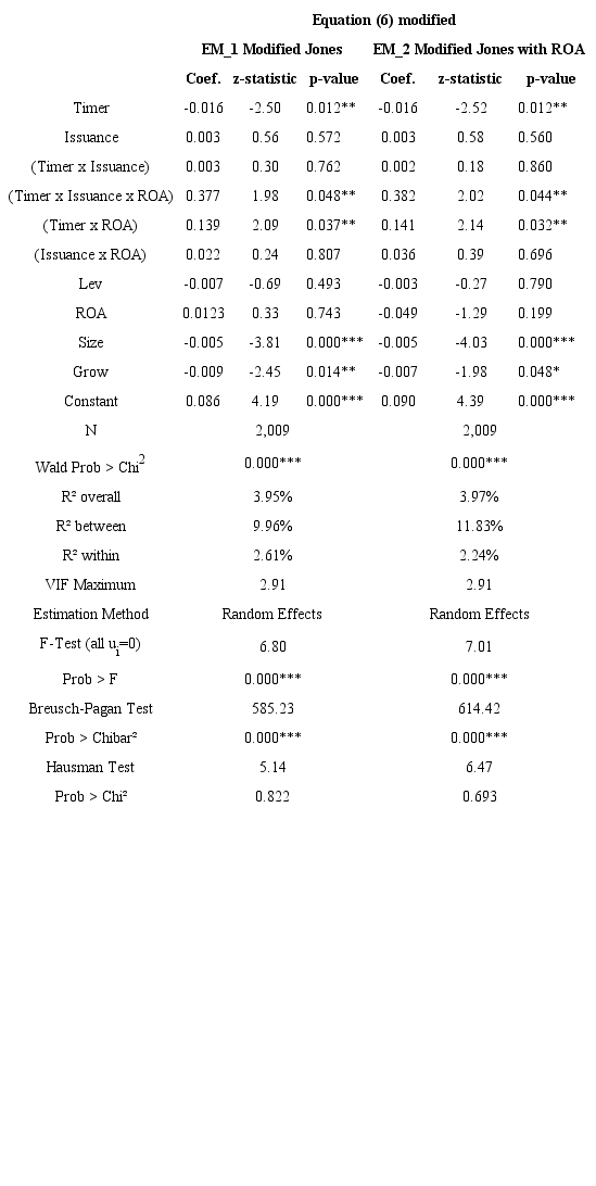 The variable (Timer x Issuance) indicates that companies that practice equity market timing feature higher earnings management levels around the issue period. When replacing (Timer x Issuance) with the interaction variable (Timer x Issuance x ROA) in the initial model, we get to identify if companies with more earnings management use the market timing through the disclosure of higher profits and profitability. Table 6 shows that this happens: the ROA of companies that practice equity market timing has a positive and significant relationship (at the level of 5%) with the EM variable around the issuance period of SEOs (on both Modified Jones and Modified Jones with ROA models).