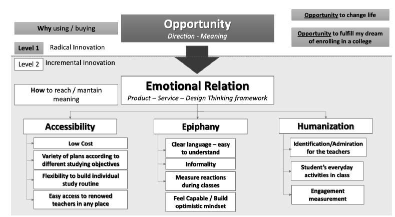 According to the collected data, the meaning of the company was created by its founder and former CEO. This fact is aligned with the model of Verganti and Öberg (2013), who recommend that in radical meaning innovations, the direction or purpose of the company is created by its main executive’s perceptions and ideas. It is important to say that none of the interviewed executives knew exactly how the purpose of the company was created, but all of them reported that it was Marco’s (founder/CEO) idea. In other words, the data collected with the managers shows that the meaning proposed by them is to create an opportunity for the users to enroll in a college. “For a very big margin, it means something that revolves around opportunity and hope. Mainly because many teachers here still work, or used to work, in expensive institutions... No doubt, many of our students would not be able to pay for a course that counts with teachers like ours. Therefore, there is a matter of opportunity, which maybe is the first feeling that the student has” (marketing manager and geography teacher).