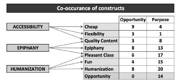 The coding process also allows verifying some co-occurrences. All the statements classified as OPPORTUNITY (for moments when the interviewee reported that Descomplica’s proposal was explicitly opportunity), and PURPOSE (used for all moments when the respondents defined the purpose of Descomplica), there was a concomitance in all codes linked to the main constructs that drive the actions inside the company (Figure 2 shows how often). In other words, whenever managers defined Descomplica’s meaning, they used reports aligned with accessibility, epiphany, and humanization.