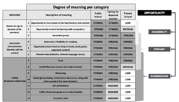 The respondents belonging to the group from public schools evidenced a stronger alignment to the meaning proposed by Descomplica. This is the group where the company gets more return on its proposal for meaning: all respondents showed a bigger emotional link with Descomplica. That type of feeling is expressed in the following narrative: “This is what I need, to be prepared, to succeed in the exams, to fulfill my dream, but also with a plus, not just the course, because I can meet people who are in the same level as me, and to be a better person” (C.A. student. Category: public school).