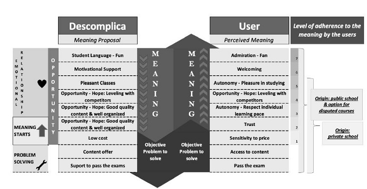 Figure 4 depicts the moment where the perception of meaning begins (starting from a trust relationship) and summarizes the comparison between the meaning proposed by Descomplica and the user’s perceptions of that meaning (in different levels).