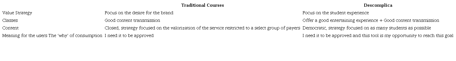 The data collected with the students’ narratives showed evidence of an emotional connection between users and Descomplica. A few statements explicitly contained meanings as ‘loving’ or ‘being a fan of’ the company. The existence of an emotional relationship shows that Descomplica signifies the challenge to absorb the educational content to pass exams in a unique way. These evidences are partially in accordance with the concepts of meaning innovation described by Verganti and Öberg (2013), where meaning creation precedes a strategy of innovating by solutions.