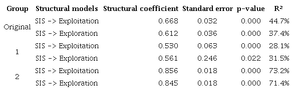 From the differences presented by the PLS-POS segment (Tables 8 and 9), the structural models for ‘segment 1’ and ‘segment 2’ were calculated. Table 10 presents the results of the structural models with statistical significance (p-value < 0.05), convergent validity, and reliability according to Hair et al. (2017). Additionally, the PLS-MGA method was used to compare the path coefficients of the models to those of the original sample, revealing differences in the relationship between SIS and exploitation innovation (| p1 - p2 | = 0.326; t-value = 6.185; p-value < 0.001) and in the relationship between SIS and exploration innovation (| p1 - p2 | = 0.284; t-value = 10.463; p-value < 0.001).