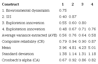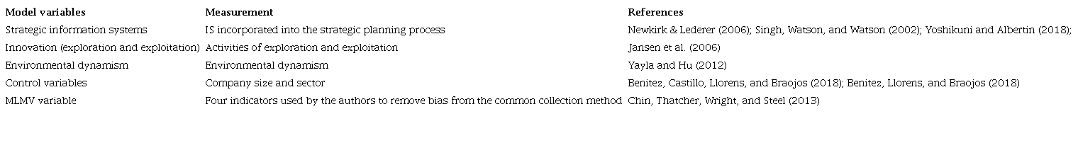 We measured the exploration and exploitation innovation construct with measures and items of the organizational unit level developed by Jansen et al. (2006). The SIS measurement method used was identified from seminal studies available in the IS academic literature (Newkirk & Lederer, 2006; Singh et al., 2002), and uses the scale already operationalized in a recent study by Yoshikuni and Albertin (2018). The Yayla e Hu (2012) scale was used to measure environmental dynamism uncertainty.