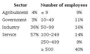 We used the organization as our research analysis unit, and the respondent sample includes business and IT/IS executives who are superintendents, presidents, or directors (39%); managers and coordinators (36%); and supervisors with decision-making power (25%). Table 2 describes the composition of the sampled organizations by sector and the number of employees. The sample is mainly composed of organizations from the service and industry sectors (93% of the companies surveyed) and 40% of the organizations have 500 or more employees.