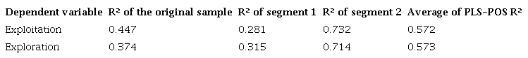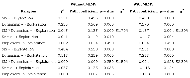 Additionally, our post-analysis study examined unobserved heterogeneity in the sample (in two segmented groups from the original research model) and shows for 165 companies in segment 2 - greater observable variable representativeness for companies of the service sector (38%), with more than 500 employees (29%) and operating under high dynamism (42%) - an increase in the path coefficients of SIS relations and exploitation innovation (β = 0.856; p-value < 0.001; R2 = 73.2%) and of SIS and exploration innovation (β = 0.845; p-value < 0.001; R2 = 71.4%). Such results demonstrate that in certain clusters (sector, size, and a high degree of dynamism), SIS have strong and positive effects in enabling exploitation and exploration innovation in the presence of environmental uncertainty, which is in line with IS studies demonstrating the importance of a segmented analysis of samples to identify IT value-added in business environments (Mikalef & Pateli, 2017; Wilden & Gudergan, 2014; Yoshikuni, Lucas, & Albertin, 2019).