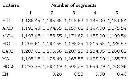 To identify the number of unobservable segments, the FIMIX-PLS algorithm (SmartPLS software v3) (Ringle, Wende, & Becker, 2015), was used and performed 10 times for g = 2-5 segments using the Akaike information criteria (AIC), modified AIC with factor 3 (AIC3), Bayesian information criterion (BIC), consistent AIC (CAIC), Hannan-Quinn criterion (HQ), and standardized entropy statistics (EN), which serve as satisfactory criteria for the selection of segments.
