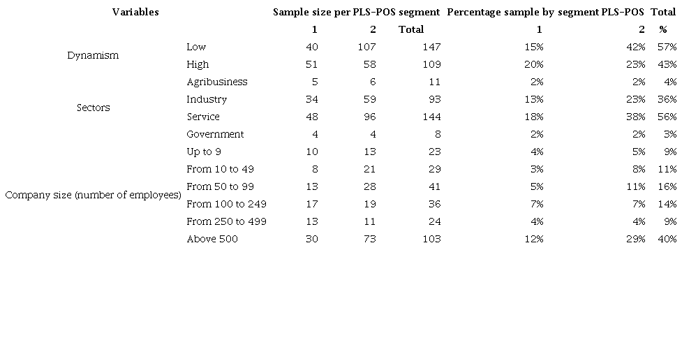 In addition to these criteria, the minimum sample size must be met, which in this study was identified as 50 cases, that is, the maximum number of structural paths that point to the dependent variable (5) multiplied by 10 according to criteria used in the methodological literature (Hair et al., 2017). The criteria presented in Table 6 specify that the 2-segment solution is the most suitable, and thus, it was possible to proceed with the prediction-oriented segmentation approach (PLS-POS).