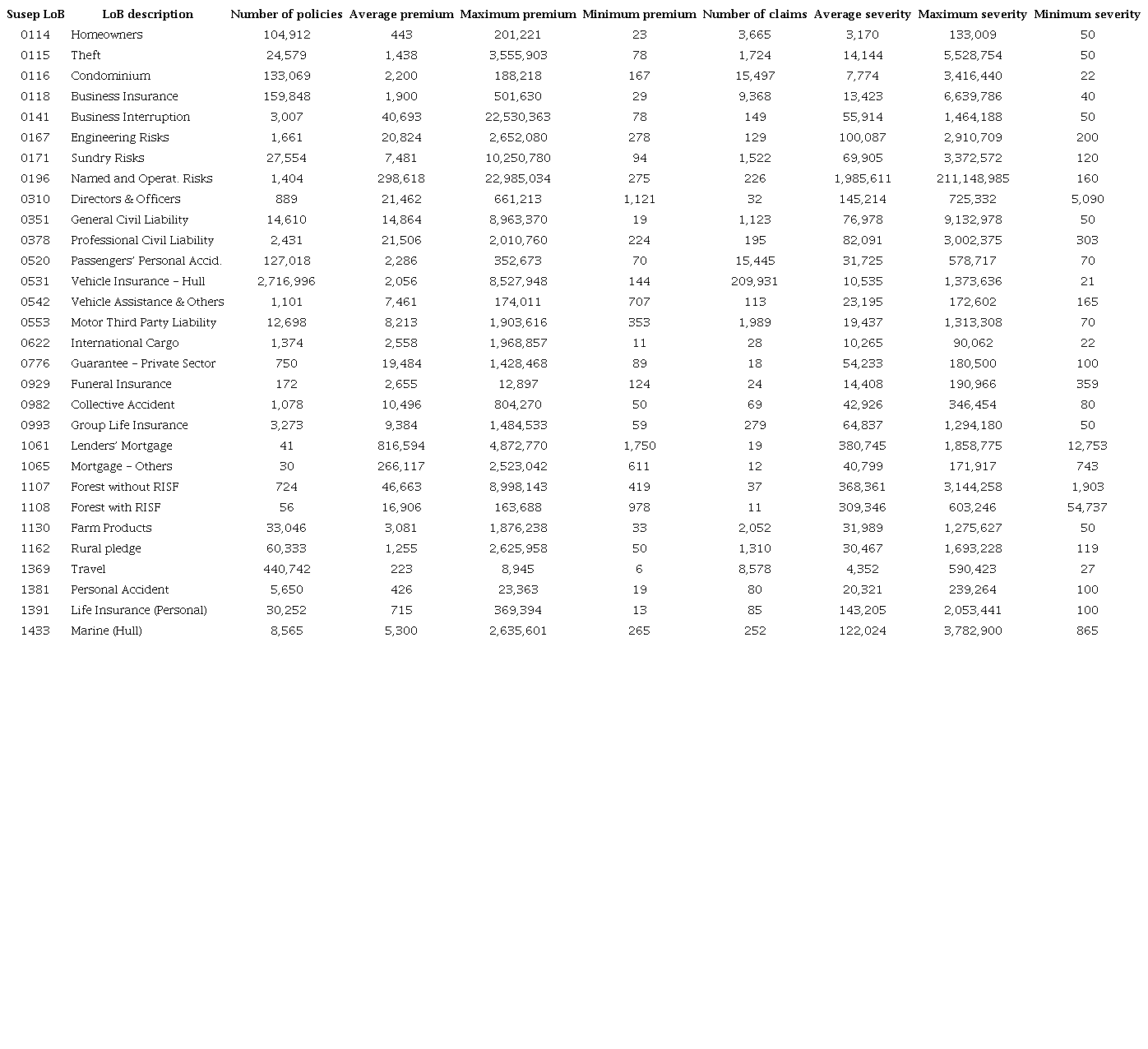 The database used contains 3,917,863 policies, segregated into 30 LoB coded by Susep, with their respective issues made at some point in the time between Jan 1, 2015 and May 1, 2018, comprising three years of issuance and claims occurrence. The reason for the segregation into LoB is that there is disparity in relation to the contract general conditions, risk specificities, exclusion clauses, and other characteristics, including insurance contractual lifetime standards: each policy has its own contractual duration. For this reason, all contracts were brought on an annual basis (most common situation in the sector), to be included in the Cramér-Lundberg model, a process whose development takes place as variations in the result between revenues (from premiums) and expenses (from claims), which is fundamentally based on the cash basis accounting (and, in this particular paper, on annual basis).
