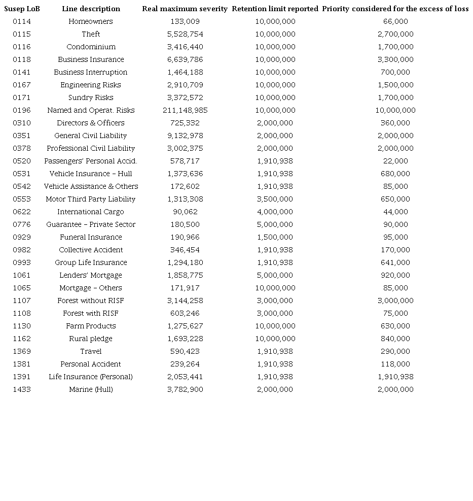 Initially, the priority choice, by line of business, was made in view of the RL reported on the official platform SES-Susep, as of August 2018. However, it was found that the claims history, in general, did not contain severities that exceeded the reported RL. Thus, the extraction values were assumed as a reinsurance contract priority only for the LoBs whose assumption was applicable. These lines of business are detailed in Table 7.