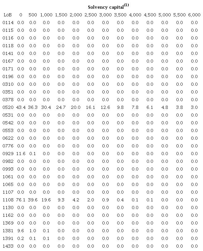 The first conclusion that Table 4 provides is that each LoB has its own dynamics. It is observed that several businesses present ruin probabilities close to zero (among which are important classes such as 0118, 0310, 0531, 0553, 1061) even with no solvency capital, while others have significant reductions with increases in the initial reserve (0171, 0929, 0993, 1130, 1381, among others). At the opposite extreme, some relevant LoBs (0196, 0520, and 1108) continue with ruin probability equal to 100% or close to this level, even with high volumes of solvency capital. This (almost) certain ruin has as its main argument the fact that the claims of these businesses have high levels of reinsurance, preventing, precisely, that these insolvency scenarios materialize (the line 0196, for example, by Table 1 has the claim with greater severity of the database - approximately BRL 211 million).