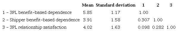 Table 2 shows all the items that were used after the purification process. The composite reliability (CR) index of all constructs reached generally acceptable levels above 0.7 in all cases (Hair et al., 2014). Convergent validity was used based on the average variance (AVE). Two constructs had AVE greater than or equal to 0.5, indicating convergent validity (Hair et al., 2014; Kline, 2011). The convergent validity of the 3PL benefit-dependence construct was close to this limit and was therefore considered satisfactory. Finally, the discriminant validity was tested by checking the difference between the χ2 statistic of a nested model (when the correlation between the constructs is equal to one) and the models where the correlation between the constructs is free (Bagozzi, Yi, & Phillips, 1991). The three constructs of the study were paired, and the differences in χ2 were calculated. The results showed that the constructs are different because the difference of χ2 for all pairs was significant at p < 0.01.