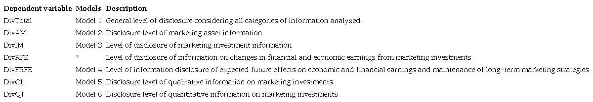 We performed data collection by reading the financial reports and manual annotation in an electronic spreadsheet by the authors. We define categorization a priori considering that we follow the suggestions of the regulatory bodies. The technique used was thematic analysis (categorical), which identifies nuclei of the meaning of communication. The categorization criterion applied is the logical-semantic method, whose scope follows parameters and logical definitions. We apply binary coding to the data to make it possible to measure the information levels of marketing investments, assigning code 1 when the company performs the disclosure of information and code 0 for the absence of information (dummy). This binary coding allowed to measure the level of marketing investment disclosure in different perspectives (for example, marketing assets, marketing investments, financial and economic effects of marketing investments, and future perspectives) and to make inferences and interpretations considering subcategories, such as the types of information (qualitative or quantitative). The identification of the different perspectives of the information allowed subdividing the dependent variable into six distinct variables, generating six study models (Table 3).