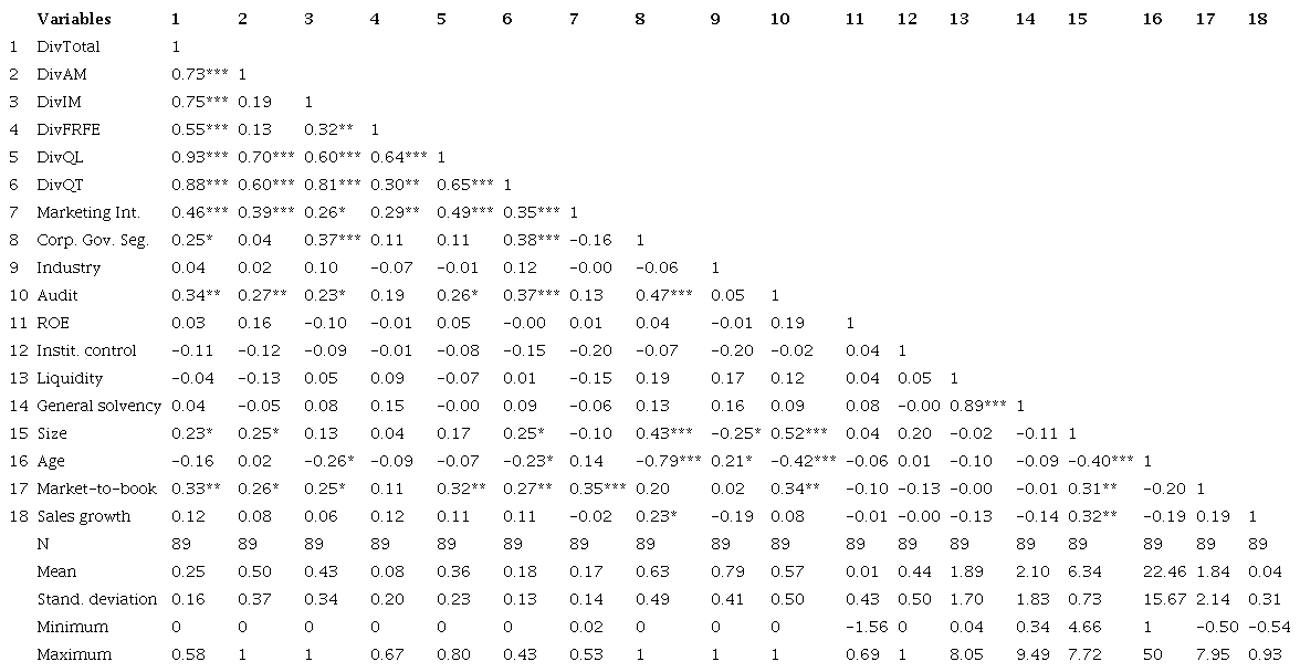 The estimation model contains covariables to control the effects that other elements generate on voluntary disclosure decisions. These covariables are: (a) corporate governance segment, considering that transparency is one of the requirements for a company to be listed in the highest segments of the levels of governance; (b) industry, segregating cyclical and non-cyclical consumption companies because they are exposed to different risks due to the influences of the economic expansion and retraction cycles; (c) auditing, due to the fact that the Big Four companies have more independence regarding voluntary disclosure recommendations compared to smaller audit companies; (d) ROE, representing the measure of profitability whose variability can arouse different interests of investors for information; (e) institutional control, considering that institutional investors can access privileged information or have greater ability to interpret the information; (f) liquidity, which signals to the market the management of short-term obligations; (g) solvency, which signals to the market the management of long-term obligations; (h); size, considering that large companies have a greater capacity to bear the costs of voluntary disclosure; (i) age, given that companies that have been publicly traded for longer have had more opportunities to define the content of the information disclosed; (j) market-to-book, because of the effect of the company’s market value on investors’ curiosity; and (k) sales growth, because of the effects of monitoring by competing companies. All variables went through the winsorization procedure at the 2.5% level to avoid problems with outliers (Mizik, 2010). Table 4 shows the operationalization and the source of data for the variables used in this work.