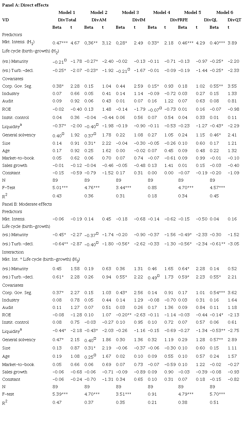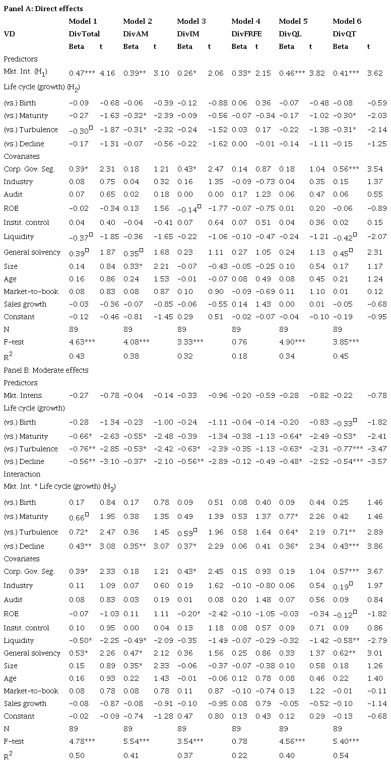 Panel A in Table 7 shows the relationship of the life cycle phases, grouped into three categories. Companies that are in the birth and growth stages in the life cycle are the reference group in the regression model (intercept). The results indicate that companies in the maturity phase disclose less marketing information to companies that are in the birth and growth phases (Model 1: β = -0.21, p < 0.10). There is a lower level of disclosure in companies in the maturity phase, compared to firms in the birth and growth phases, considering exclusively the disclosure of marketing asset information (Model 2: β = -0.27, p < 0.05) and disclosure of quantitative marketing information (Model 6: β = -0.25, p < 0.05).