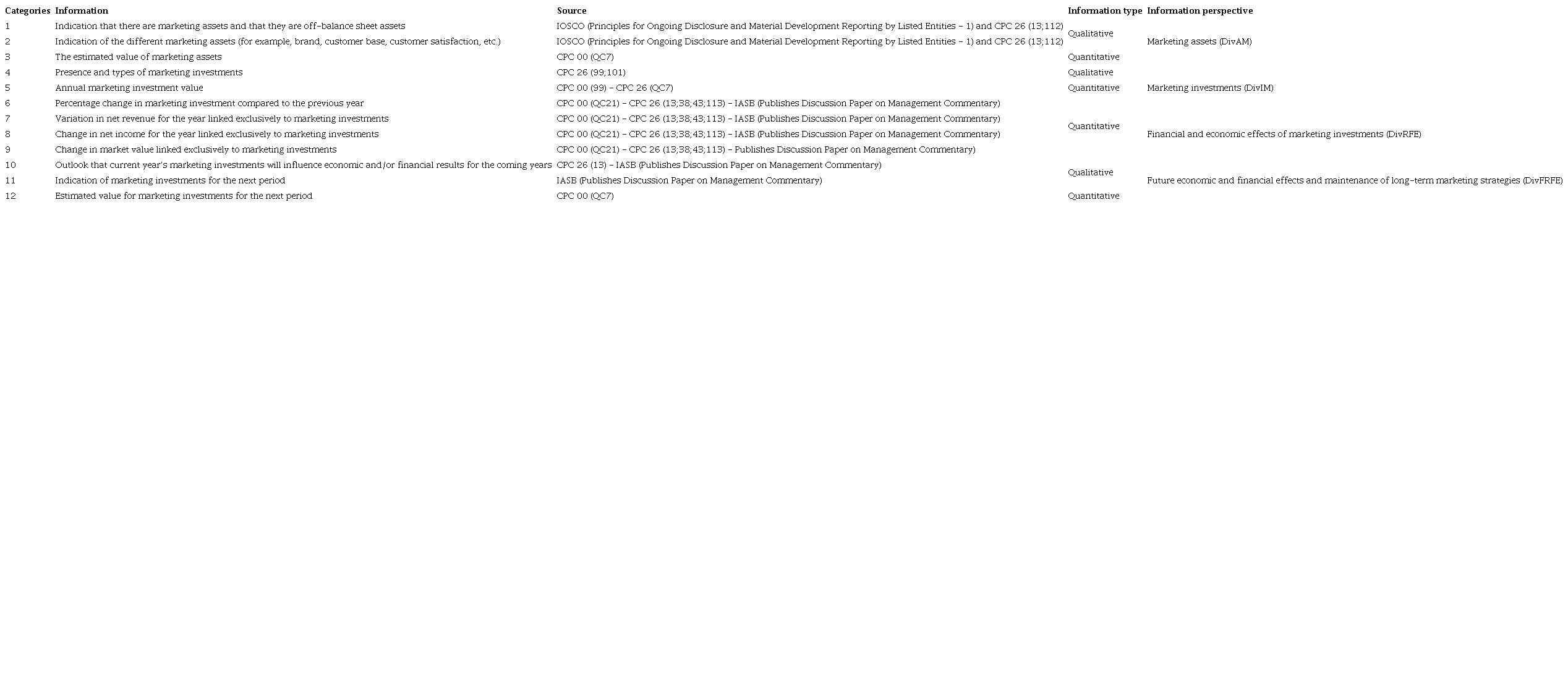 The dependent variable of this study is the level of marketing investment disclosure. We built this variable using the content analysis technique that aims to identify the essence of textual communication (Bardin, 1977). We analyzed voluntary disclosures suggested by regulatory bodies by identifying 12 categories of voluntary marketing information (Appendix A). The information in categories 1, 2, and 3 deals with off-balance sheet marketing assets. Categories 4 and 5 are information on resources and budgets directed to marketing investments. Categories 6, 7, 8, and 9 are information related to the growth or decrease of marketing investments and the respective effects on the company’s results. Finally, categories 10, 11, and 12 contain information related to the perspective of future investments and the expected results for the current investments.