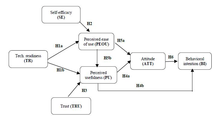 Although TR refers to general beliefs regarding technology, there are intuitive relationships between TR and TAM’s constructs (Ratchford & Barnhart, 2012). Parasuraman and Colby (2015) suggest that higher TR leads to higher PEOU and BI, and propose further studies to understand the relationships between their TR scale (Technology Readiness Index 2.0 - TRI 2.0) and TAM. The theoretical association between TR and TAM constructs was tested with various technological products and services. As suggested by Venkatesh (2000), PEOU and PU are significantly influenced by TR, as a global measure (Ferreira et al., 2014; Lin, Shih, & Sher, 2007) or split by its four dimensions (Lam, Chiang, & Parasuraman, 2008).