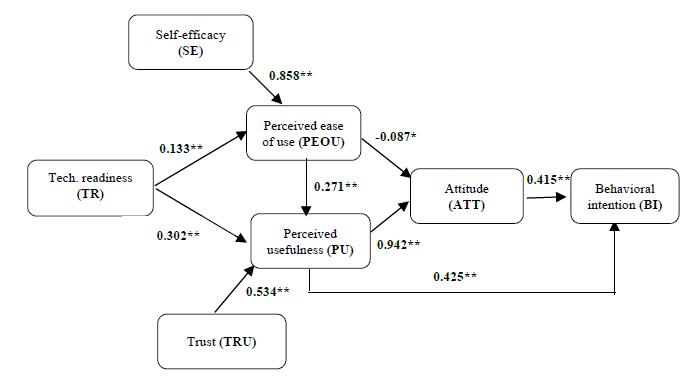 In regard to PEOU’s antecedents, results corroborated the literature (Rahimpour et al., 2008; Tsai, 2014; Yun & Park, 2010), suggesting self-efficacy (SE) is a major driver (0.858) of PEOU for technology acceptance. As suggested by Venkatesh and Davis (1996), both constructs share similarities and, as in the case of teleconsultation, the lack of previous experience with the evaluated technology increases the power of SE in determining consumers’ PEOU. In addition, and in line with Ferreira, Rocha, and Silva (2014), given that technology readiness reflects individuals’ beliefs on how secure and comfortable they would feel in using new technologies, the observed significant positive impact of TR on PEOU (0.133) possibly results from that optimistic point of view in relation to new technologies’ complexity. People who believe to have some control over technology tend to find it easier to experiment new technologies, such as teleconsultation (Kuo et al., 2013; Lam et al., 2008).