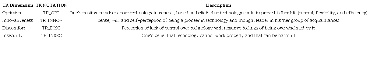 In measuring the level of individuals’ TR, Parasuraman (2000) and Parasuraman and Colby (2015)observed that consumers simultaneously presented positive and negative views about technologies. Positive views act as motivators, contributing positively to TR, whilst negative views conceive the inhibitors that diminish consumers’ TR. The views were categorized in four dimensions: optimism and innovativeness as TR motivators, and discomfort and insecurity as TR inhibitors (Yeo et al., 2019). These dimensions reflect relative distinct behaviors that can lead, in some cases, even to paradoxical consolidated results, such as concomitant strong positive and negative feelings toward a technology by the same consumer (Parasuraman & Colby, 2015). Table 1 depicts the clear distinction among the unique characteristics of TR’s dimensions.