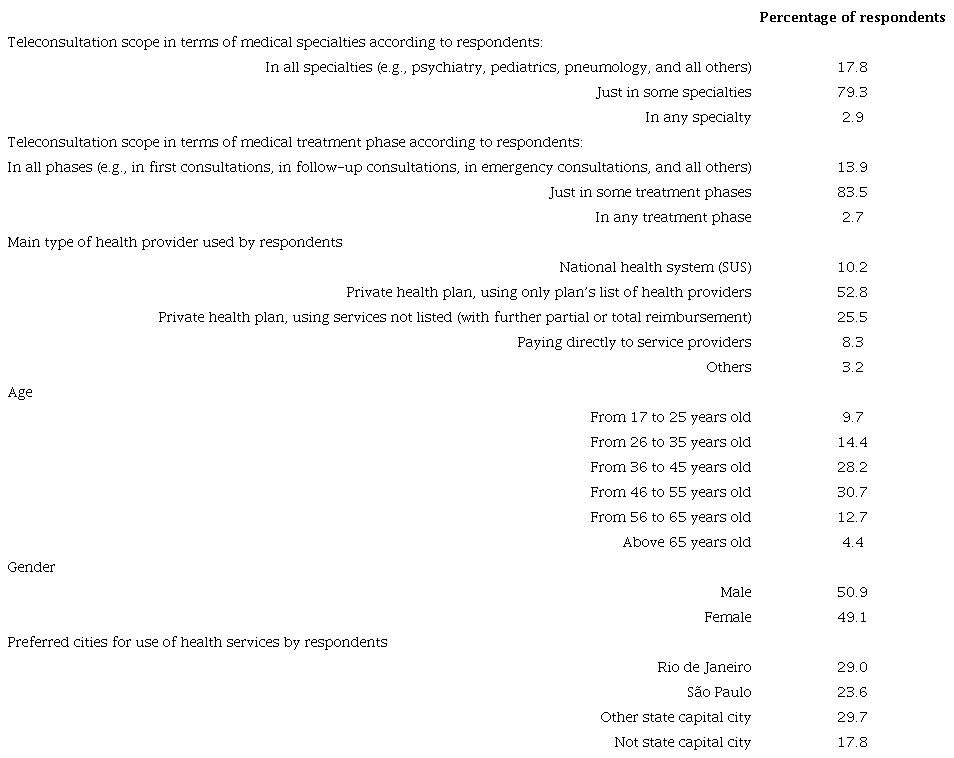 According to valid answers, only 26.7% of respondents could be classified as regular users of teleconsultation (having experienced the service more than once). From the remaining 73.3%, a total of 19.0% believed that they could have used teleconsultation once, and the remaining 54.3% said that they had never used such service before; however, the great majority (80.0%) had already heard about it. Part of the respondents had already been advised by their doctors (20.0%) or their health plans (27.2%) to use the service. Most respondents believed that teleconsultation should be implemented in Brazil, be it with a limited scope regarding medical specialties (79.3%) or only for limited phases of the health treatment (83.5%). Answers came from 17 out of 27 Brazilian states. Additional information about the sample group can be found in Table 2.