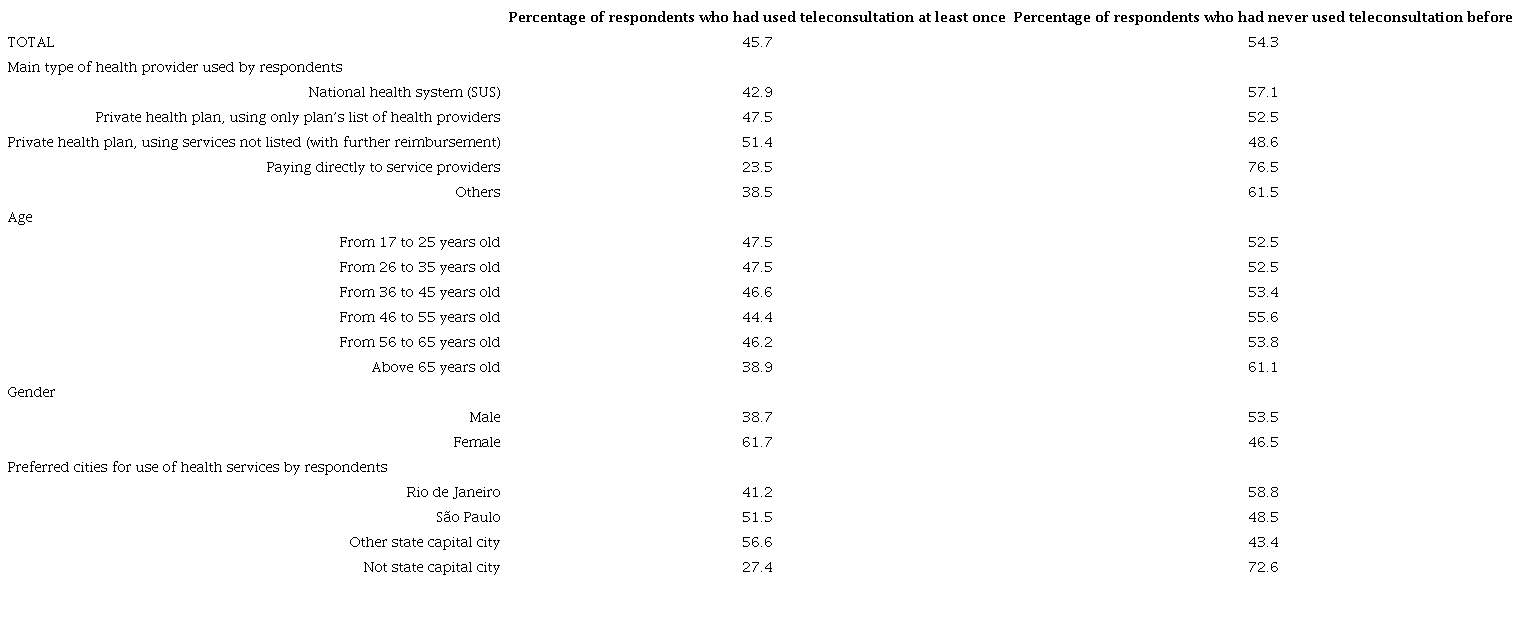 Comparing the demographic profiles of the respondents who might have used teleconsultation at least once (45.7%) to the ones that had never experienced teleconsultation before (54.3%), Table 3 shows that teleconsultation’s penetration had only reached the majority of the sample population in four sub-groups of respondents: (a) women (53.5%); (b) holders of private health plans with reimbursement conditions (51.4%); (c) respondents who search for health services in the city of São Paulo (51.5%); (d) or in other Brazilian state capitals (56.6%), except Rio de Janeiro. On the other hand, respondents who (a) pay directly for their health services (23.5%), (b) are over 65 years old (38.9%), (c) are men (38.7%), and (d) do not live in Brazilian state capitals (27.4%) seem to be more resistant to experiencing teleconsultation so far. Such results suggest that, as predicted in this study’s scope, teleconsultation is still at its earlier stages of implementation in Brazil.