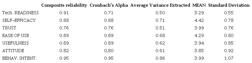 Table 5 shows positive correlations in all cases, demonstrating nomological validity for the model (Hair et al., 2009). In order to measure variables’ fit to model’s proposal, convergent validity and reliability were further examined for each construct. Table 4 shows results for composite reliability (CR), average variance extracted (AVE), Cronbach’s alpha coefficients, and descriptive statistics (mean and standard deviation).