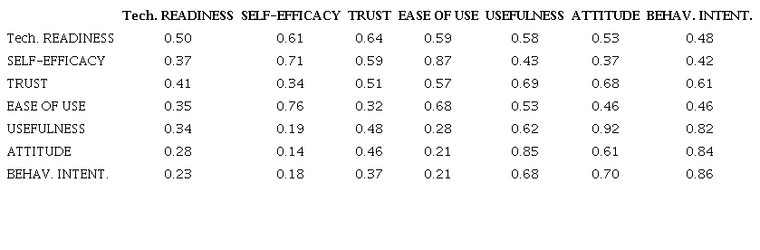 The examination of the Table 5 shows that almost all shared variances are lower than the variance extracted by the items measuring the constructs, with the exception of the pairs self-efficacy/ease of use, usefulness/attitude, usefulness/intention, and attitude/intention. Given those exceptions to Fornell and Larcker's (1981) criteria, we performed an additional test to ensure discriminant validity as indicated by Anderson and Gerbing (1988): for each problematic pair of constructs (SELF/PEOU, PU/ATT, PU/BI, and ATT/BI), we calculated the difference between the original model with correlations allowed to be free and one constrained model that fixed each problematic correlation to unity (i.e., perfectly correlated). Results for all cases showed that statistically significant and lower χ2 values were found for the unconstrained models, providing evidence that discriminant validity was achieved for self-efficacy, ease of use, usefulness, attitude, and behavioral intention.