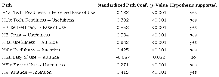 The authors then verified the path coefficients to test the study’s hypotheses in terms of significance, magnitude, and direction (Byrne, 2010). Figure 3 and Table 6 show significance in all hypothesized relationships. Finally, the proportions of the variance explained for each of the four dependent variables of the model were: 47.2% for usefulness; 67.7% for behavioral intention, 75.3% for easy of use; and 84.4% for attitude.