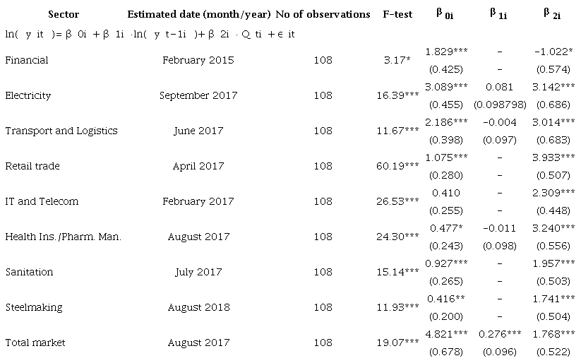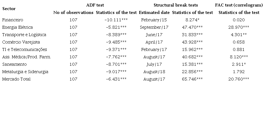 The results suggest that the evaluated datasets are stationary based on the ADF unit root test (Table 1). Regarding the structural break test (Table 1), the results were statistically relevant within a 95% confidence interval, except for the financial sector. The tests suggest that there were changes in the trend of debenture issue throughout 2017 in the market in general, except in the steelmaking industry, which showed a statistically significant change in trend in August 2018.