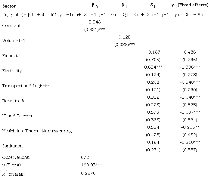 Next, in order to compare the sectoral effect on the total volume issued by the debenture market after the crash, a panel estimation was used. In this case, as the panel model is dynamic, its estimation was performed by using the two-stage least squares method (2SLS). Thus, the volume calculated in t-2 and the variation between the volumes in t-1 and t-2 were used as instruments, as shown in (4):