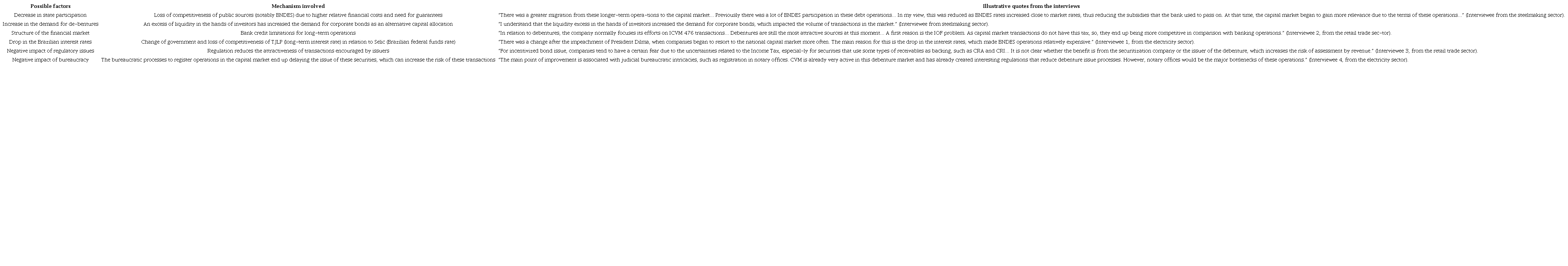 Therefore, the following blocks of factors emerging from the interviews were defined and that may explain the evolution of the debenture market and its sectorial variations: (a) reduction in state participation; (b) increased demand for debentures; (c) structure of the financial system; (d) lower interest rates in Brazil; (e) negative impact of regulatory issues; (f) negative impact of bureaucracy. Table 4 lists these factors, their mechanisms involved, and includes illustrations of quotes from the interviews conducted herein.