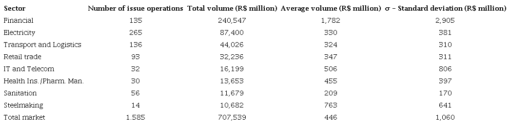 The quantitative results of the study suggest that, in fact, there was a change in the trend in debenture issuance in the Brazilian market from 2017 onward, both for the market as a whole and for the sectors assessed. Furthermore, it was possible to observe that some of the sectors included in this study had a statistically superior performance than others - notably, the electricity sector, with an average annual growth of 55% in issue of debentures as of 2011.