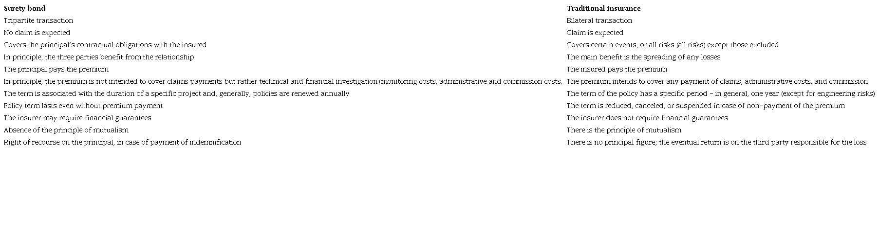 Furthermore, conventional insurance has a statistical actuarial calculation based on the general behavior of the insured portfolio (Hoffmann & Girolamo, 2017). In contrast, the SB tends to be more similar to credit insurance (Russel, 2000). It implies that the premium is not calculated based on the possibility of an event occurring, but based on a financial credit from the guarantee to the principal, where the underwriting process is more rigorous in that the contractor must provide all confidential information about its finances and business plans (Beg, 2019). Galiza (2015)ponders whether the SB can be considered insurance since some characteristics of this product are not consistent with the standard usually established in traditional insurance. Table 1 compares the typical elements of SB and traditional insurance.