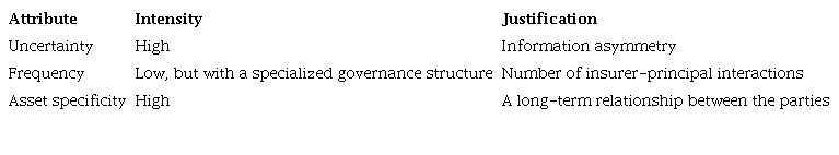 The set of transactions under analysis is carried out between actors from different markets in a tripartite relationship (insured-principal-insurer) with several peripheral transactions that support it in a context of high informational asymmetry, low frequency (lower transaction costs), and high asset specificity (see Table 2).