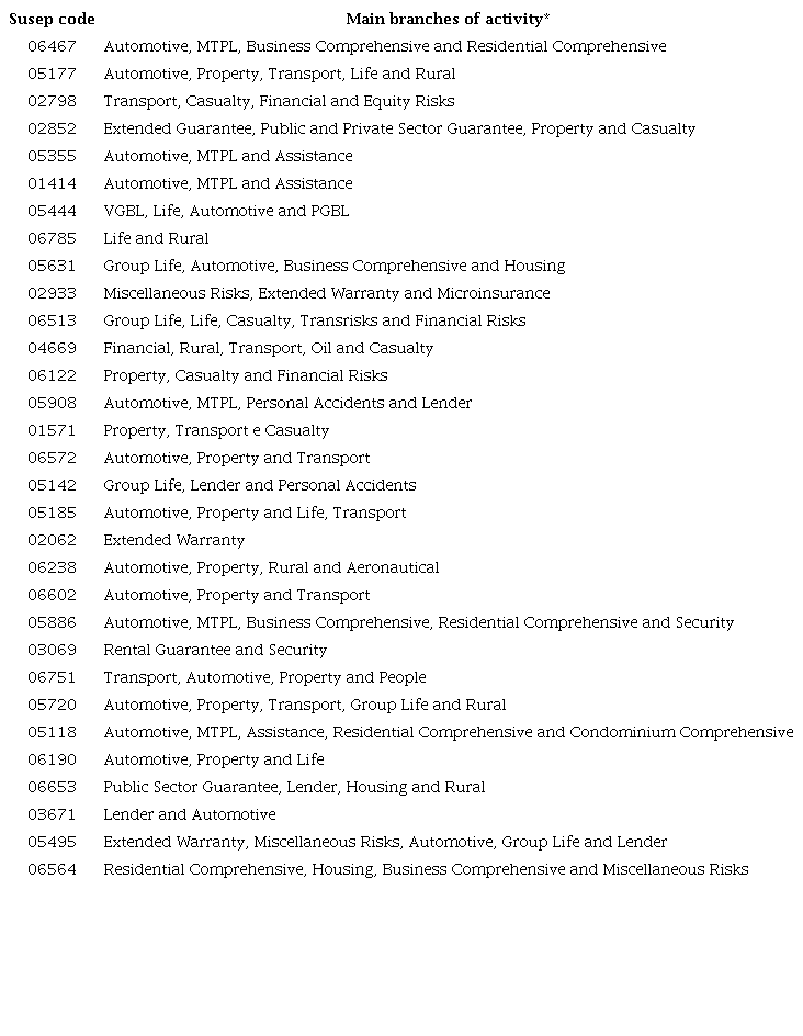Table 2 presents the list of the 31 insurers evaluated, as well as their Susep code and main fields of activity.