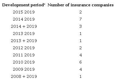 In turn, 10 different development periods were identified among the 31 insurers. Table 4 presents the number of insurers for each period class.
