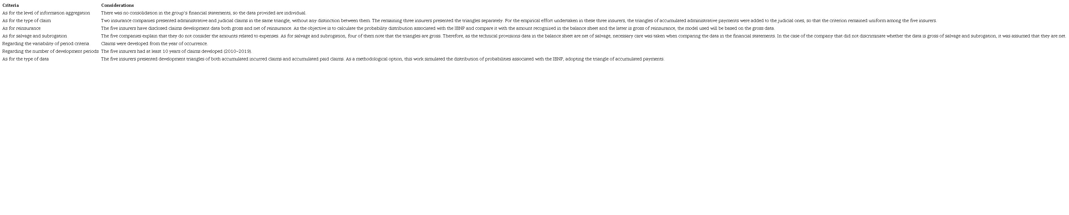 The other conditions used in choosing insurers refer to the existence of at least 10 years of claims development in the triangles; the grouping of claims made available will be in the form of accumulated paid claims; and finally, that the data presented is gross of reinsurance.