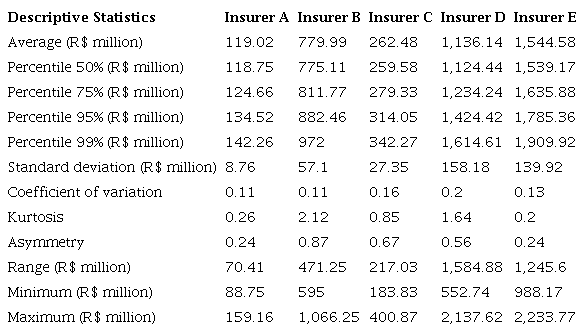 It is imperative to point out that insurers have different sizes. This can be verified by analyzing the average IBNP calculated. By way of illustration, while the insurance company A had an average IBNP of R$ 119.02 million, the insurance company E presented an average of R$ 1,544.58 million, showing the size differences.