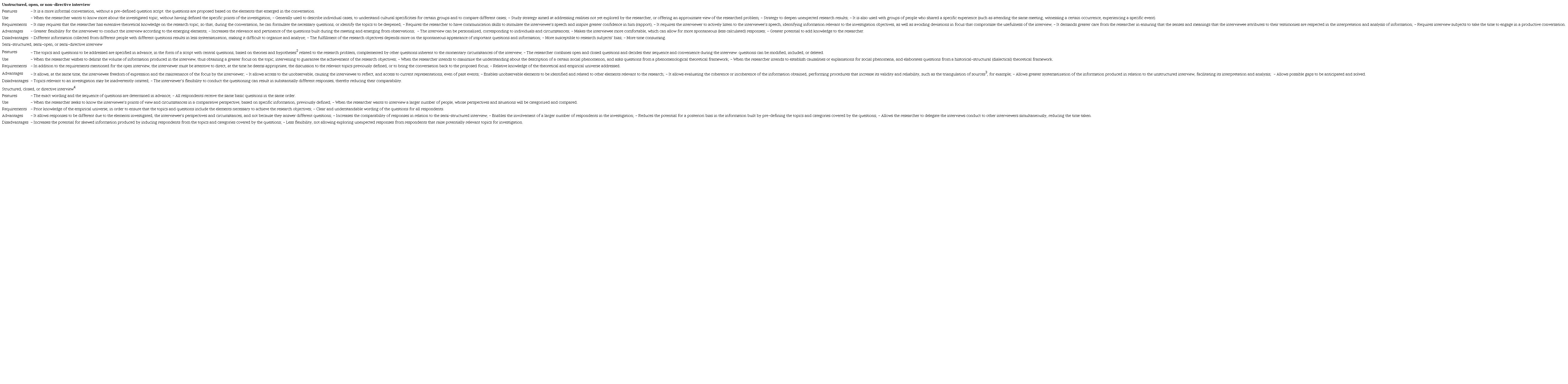 The differentiation between the types of interviews, in practice, lies in the greater or lesser degree of structuring of the questions, which reflects the purposes for which it is intended and, therefore, the research objectives. It is important to note that less structuring does not mean less planning of the interview: all types require researcher preparation, organization, and programming. The choice for one or another type of interview will necessarily be based on the adoption of a consistent theoretical framework that supports the construction of the problem and the research objectives, from which the subjects involved are defined, which, in turn, requires some knowledge of the empirical universe.
