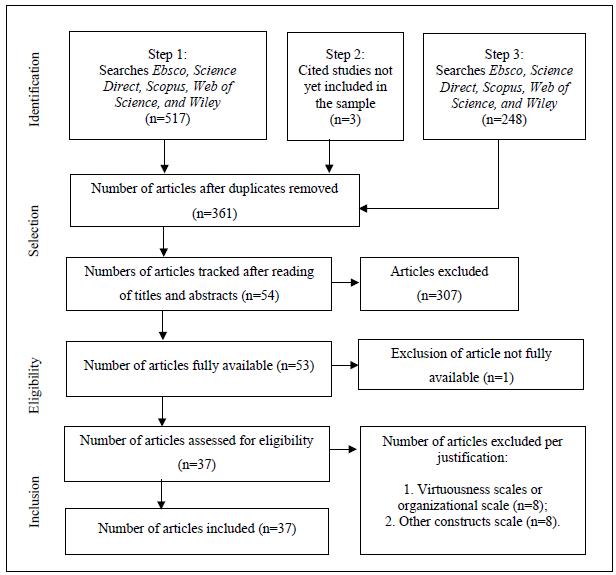 The references were exported to the Endnote 8 reference organizer in the first step and Mendeley in the last selection. The selection process during the stages was the same: first, the removal of duplicated articles; second, the reading of titles, abstracts, keywords, and name of the journal, applying the eligibility criteria. Figure 1 shows the flow of the selection process until reaching the number of 37 articles that develop or apply moral virtues at an individual level, forming the sample.