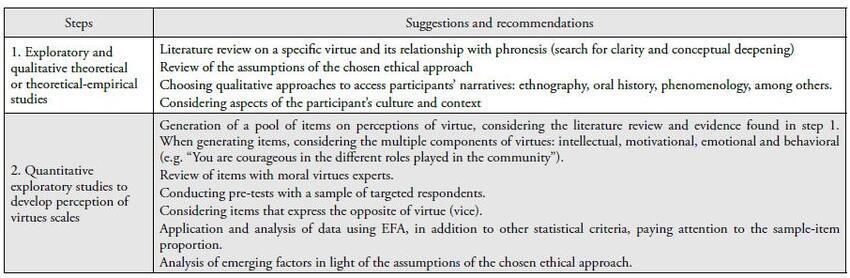 Therefore, it was possible to suggest procedures for future studies on moral virtues, organized in successive stages. The intention is to coordinate the first step with qualitative exploratory studies - which grants conceptual precision and data on the context and targeted participants - and the second step, with recommendations for the development of scales on the perception of virtues, obtaining larger sets of items, the better item-sample ratio in accessing the field, validation with experts and potential respondents, and pre-testing.