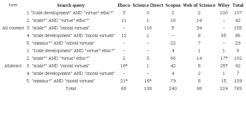 Five different queries consisting of two terms were used to expand the scope of the searches. The first term referred to scales and measurement, and the second to virtues, as detailed in Table 1.