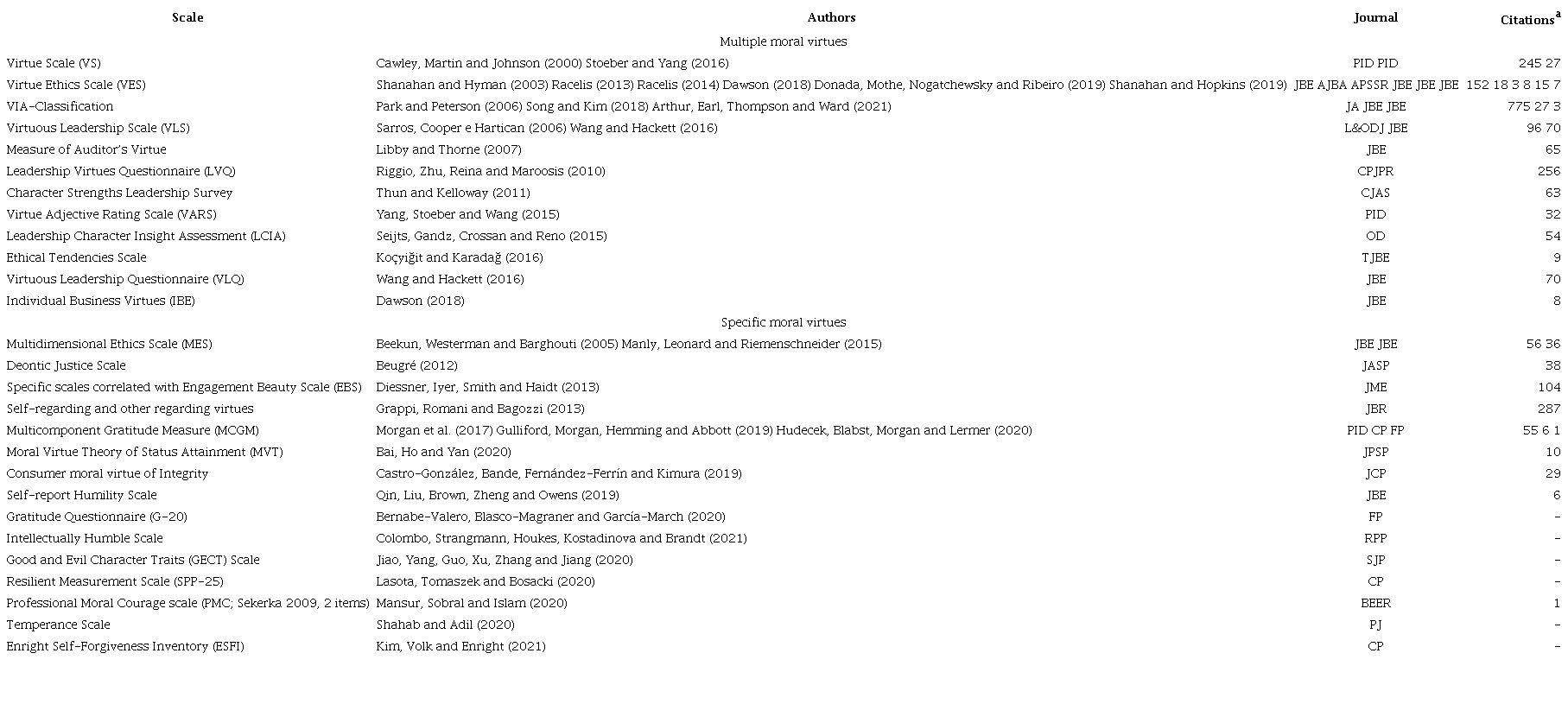 The topic has different theoretical traditions (Sison et al., 2018) and extensive lists of virtues. Although the conception of virtues encompasses components or dimensions (Newstead, Macklin, Dawkins, & Martin, 2018), empirical research has been restricted to observable traits or behaviors, revealing a methodological impasse in the relationship between the virtue ethics, originating in moral philosophy, and the experimental sciences, with certain ramifications in psychology. Given the development of new scales on virtues, this research seeks to answer the following question: ‘How are the scales for the moral virtues construct elaborated and measured in studies related to virtue ethics?’ This article seeks to analyze the scales and measures of the individual (personal) moral virtues construct, based on a systematic literature review (Snyder, 2019).