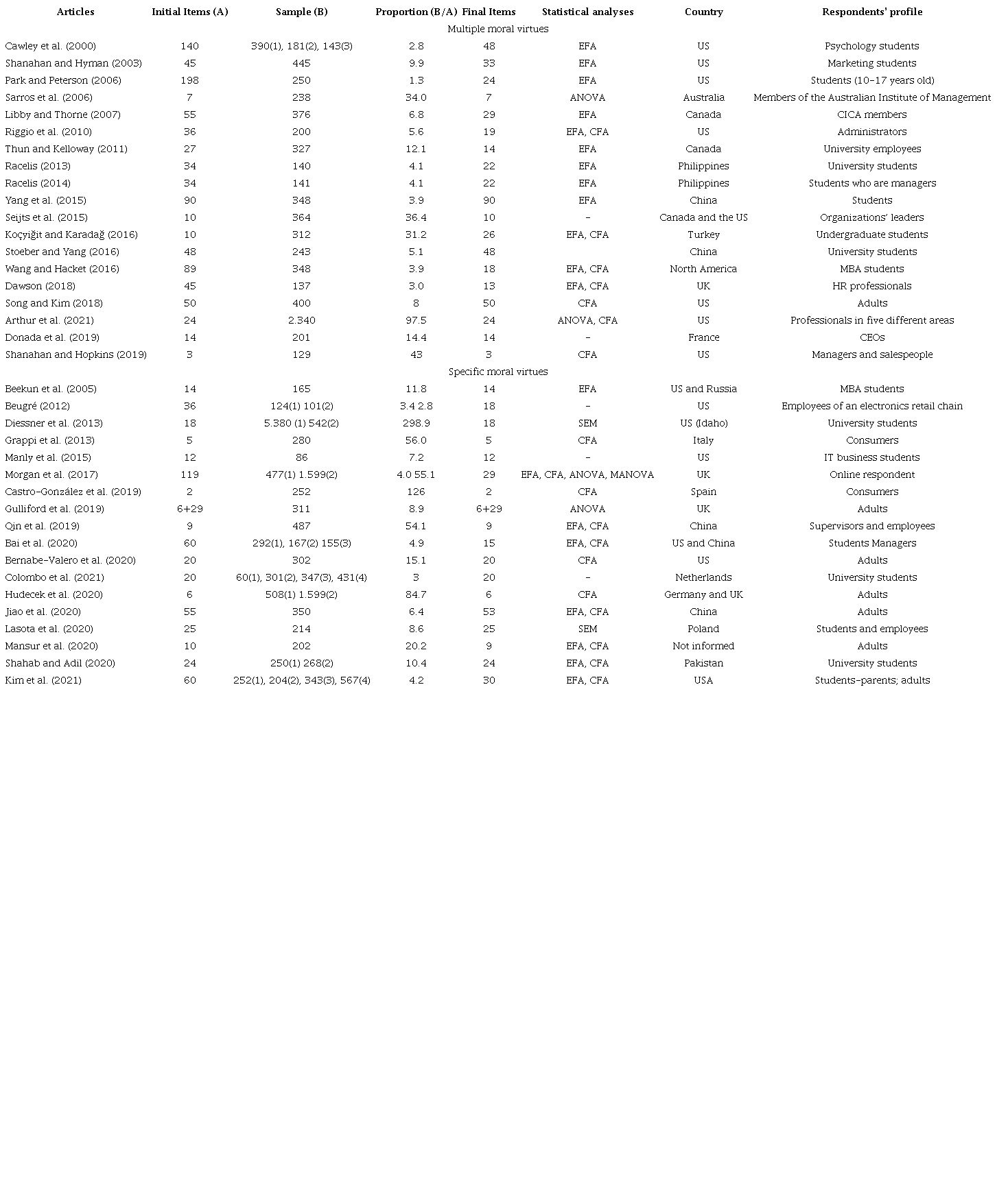 For a theoretical-methodological discussion on the development of virtues scales and measures, the articles were first thoroughly read and their primary data organized in Excel spreadsheets, containing information on (a) how the scale is constructed or applied, item generation, pre-tests, sample and respondents, item treatment; (b) statistical analysis adopted, statistical techniques, adjustment factors, analysis techniques, emerging factors; (c) eliminations of items, types of validations and related topics and; (d) country of application, to analyze possible limitations and the rigor used in creation and validation. For the analysis of the use of Exploratory Factor Analysis (EFA), Confirmatory Factor Analysis (CFA), and other techniques, we considered the guidelines by Fávero et al. (2009) and Hair et al. (2005).
