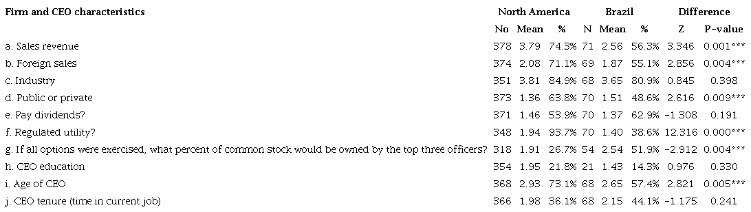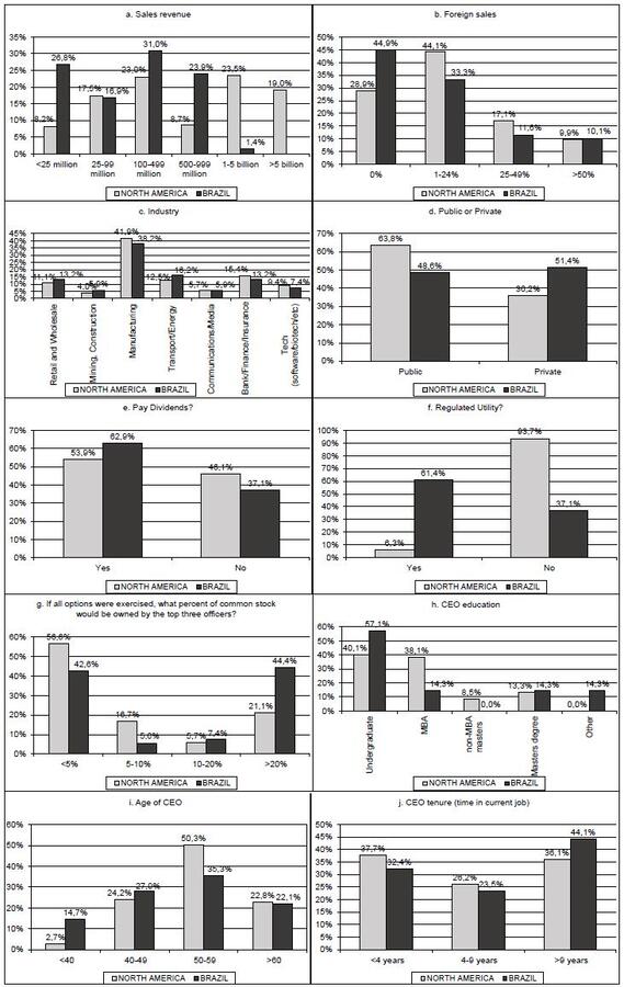 We compare our sample averages to the North American sample of Graham and Harvey (2001).1 In order to test whether the difference between the two samples is statistically significant, we applied the bicaudal Student’s t-test of mean difference for unpaired samples. Our sample significantly differs from that one in the following aspects: size (smaller), foreign sales (less internationalized), ownership (fewer public corporations), regulation (more utilities), managerial ownership (larger share of managerial ownership), and the age of the CEO (older). Figure 1 presents a comparison of both samples in more visual detail.