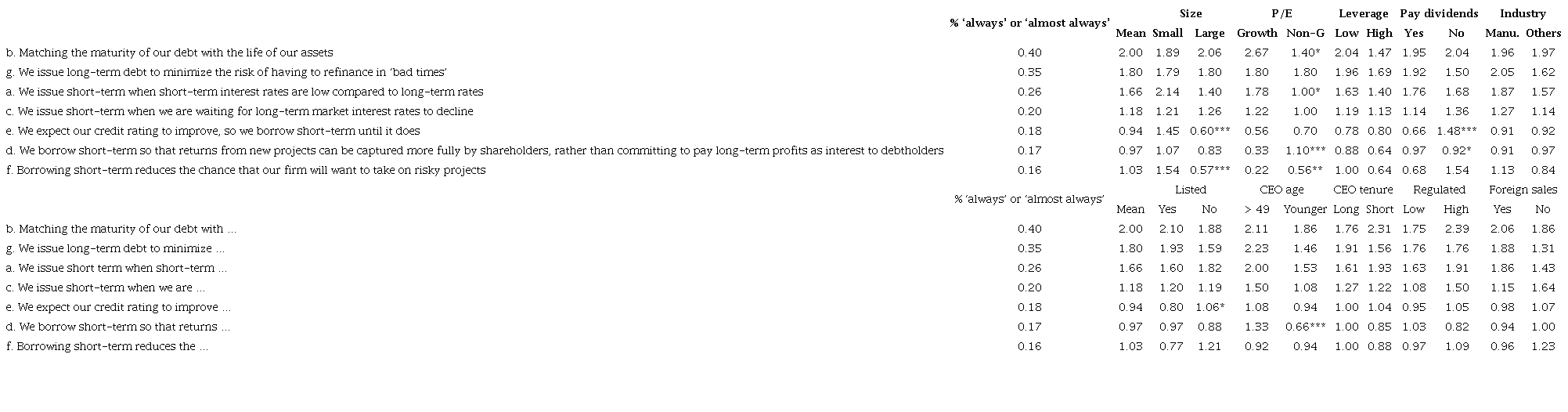 We asked managers about the factors that affect their firm’s choice between short- and long-term debt and we found that the most important factors are matching the maturity of their debt with the life of their assets (40% of responses as ‘important’ or ‘very important’) and issuing long-term debt to minimize the risk of having to refinance in ‘bad times’ (35% of responses as ‘important’ or ‘very important’). The results are presented in Table 10.