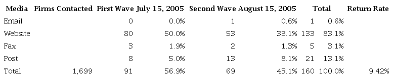 First, each firm received an email directed to its chief financial officer (CFO) or equivalent explaining the purposes of the survey and the link to the website. Next, the CFO was contacted by telephone as a follow-up. Following Klassen and Jacobs (2001), several ways to answer the questionnaire were offered to the CFOs: by post, by fax, by email, and by a website constructed specifically to that end. The usual confidentiality assurances were given in writing to all participants. CFOs were invited to participate in two successive waves. The first one started on July 15, 2005, and the second one started on August 15, 2005. The data collection was concluded on September 30, 2005.